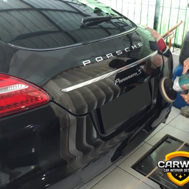 melakukan polishing untuk menyamarkan baret halus pada cat, memeberikan kesan weet look pada cat dan mencerahkan dan mengembalikan warna asli cat mobil
